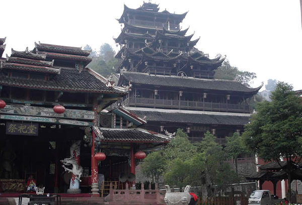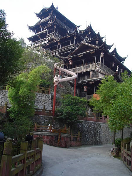 九重天 九重天世襲堂是土家風(fēng)情園的精華和靈魂所在。該建筑由土家民間藝人李宏進(jìn)設(shè)計,依80度陡坡而建,高48米,共9重12層,整個樓房全部用木栓連接,沒有一顆鐵釘,堪稱土家族建筑史上的奇跡。2002年9 月22日,九重天吊腳樓被載入世界吉尼斯世界紀(jì)錄,認(rèn)定其為目前中國最大、最高、最完美的木質(zhì)結(jié)構(gòu)吊腳樓。2001年4月6日,朱镕基總理視察土家風(fēng)情園時,對九重天贊不絕口:“一批民間匠人能造出這樣輝煌的吊腳樓,而且還解決了力學(xué)的問題,真是不簡單!鼻迦A大學(xué)著名建筑學(xué)家何重義先生說:“張家界土家風(fēng)情園完全可以和蘇州的園林相媲美。特別是九重天世襲堂,猶如玉宇瓊閣,令人神往!”古人說,天有九野,地有九州,土有九山,山有九寨。古人又把九重叫做天,說天有九重,最上一重是上帝和君主居住的地方,所以我們叫它“九重天”。