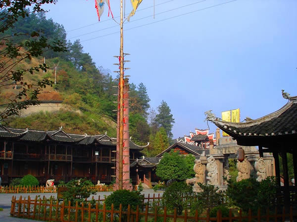 土司城 土司制度初建于五代十國時期,到了明朝己非常成熟了,土司王有無上的權(quán)威,在湘西有三大土司王分別是桑植土司向氏、永順土司王彭氏、慈利土司王張氏,其中又以永順溪州土司彭氏實力最強(qiáng)。其它土司王都為自己修建一座土司城,唯有彭氏分別在永定、永順修建了二座土司城。在永定的土司城內(nèi),彭氏為顯示其地位,修建了湘西最高的一座高達(dá) 48米,共12層的吊腳樓,整棟樓竟無一根鐵釘,堪稱土家吊腳樓建筑史上的奇跡,此樓于2002年9月被評為最高吊腳樓,榮獲世界吉尼斯之最,與此同時土司城內(nèi)舉辦一千人參加表演的毛古斯舞蹈活動獲得圓滿成功,同時獲得世界吉尼斯之最。進(jìn)入土司城,首先看到土司城迎賓儀式,土家漢子迎賓鼓,吹牛角、放沖,土家姑娘攔門歌,敬攔門酒,進(jìn)入城內(nèi),在祭祀堂前舉行百人土家大祭祖活動,男女老少唱擺手歌、跳擺手舞,登世界最高的吊腳樓九重天,參觀土家族千百年來文化展示。到土家山寨,聽土家歌,賞土家族最有代表風(fēng)俗哭嫁,三棒鼓,花燈等民俗表演。