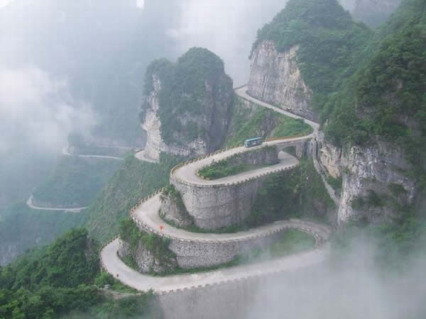 | 張家界天門山盤山公路有"通天大道"之稱,盤山公路全長10.77公里,海拔從200米急劇提升到1300米,大道兩側絕壁千仞,空谷幽深,共計99個彎,180度急彎此消彼長,似玉帶環(huán)繞,彎彎緊連,層層迭起,被譽為“天下第一公路奇觀”。