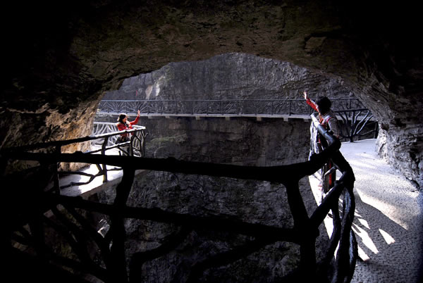 據(jù)施工人員介紹,此條棧道也是他們所修棧道中施工最難,最險(xiǎn)峻的一條。如果您還覺得不夠刺激的話,在棧道的完結(jié)處的兩個(gè)懸崖之間有一條長160米的懸索吊橋,同時(shí),在海拔最高點(diǎn)還有一個(gè)挑戰(zhàn)心里極限的玻璃站臺,在這里,如果你能挺直腰板伸開雙臂,那么,您就是真正的勇士了。