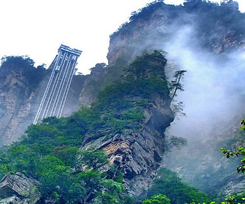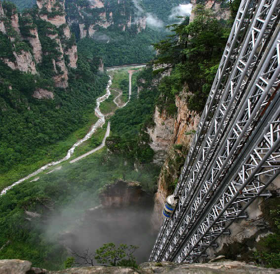 百龍電梯圖片 百龍?zhí)焯輾鈩莼趾,垂直高?35米,運(yùn)行高度326米,由154米山體內(nèi)堅(jiān)井和172米貼山鋼結(jié)構(gòu)井架等組成,采用三臺(tái)雙層全暴露觀光電梯并列分體運(yùn)行,每臺(tái)次載客50人次,運(yùn)行速度3米/秒,三臺(tái)同時(shí)運(yùn)行每小時(shí)往返量達(dá)4000人次。百龍?zhí)焯莸男藿▽?shí)現(xiàn)“山上游,山下住”的目標(biāo),提供了交通保障,將袁家界天下第一橋、迷魂臺(tái)、天懸白練以及烏龍寨、楊家界等絕世美景從幕后推向了前臺(tái),并將天子山、袁家界、金鞭溪等精品旅游線路連為一體,解決了多年困擾景區(qū)的交通瓶頸問題。