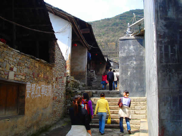 苦竹寨 賀龍在桑植革命時期,幾乎踏遍了澧水兩岸的山山水水,村村寨寨。苦竹寨是澧水邊的一座少數(shù)民族雜居的村落,保留了明清時的建筑特色,民風(fēng)淳樸,村民能歌善舞,許多桑植民歌都是靠苦竹寨的歌手流傳的。入夜的時候,苦竹寨亮起了盞盞紅燈,這是村里的一個傳統(tǒng)。當(dāng)年紅軍夜行軍過苦竹寨的時候,村里有個老婆婆怕紅軍夜黑路難走,便在家門口懸起了一盞紅燈,其它村民爭相效仿,苦竹寨成了一個燈的世界。這段軍民魚水情被寫成了歌,傳唱到現(xiàn)在,這就是《門前掛盞燈》。
