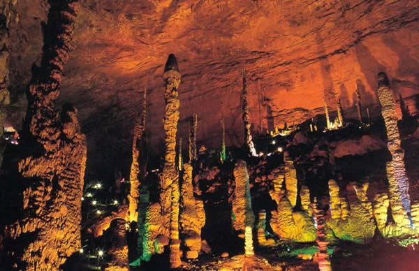 黃龍洞圖片 黃龍洞以立體的洞穴結(jié)構(gòu),龐大的洞穴空間,寬闊的龍宮廳及數(shù)以萬(wàn)計(jì)的石筍,高大的洞穴瀑布,水陸兼?zhèn)涞挠斡[線等優(yōu)勢(shì)構(gòu)成了國(guó)內(nèi)外頗有特色的游覽洞穴,洞內(nèi)有1庫(kù)、2河、3潭、4瀑、13大廳、98廊,以及幾十座山峰,上千個(gè)白玉池和近萬(wàn)根石筍。由石灰質(zhì)溶液凝結(jié)而成的石鐘乳、石筍、石柱、石花、石幔、石枝、石管、石珍珠、石珊瑚等遍布其中,無(wú)所不奇,無(wú)奇不有,仿佛一座神奇的地下“魔宮”。黃龍洞現(xiàn)已開(kāi)放有龍舞廳、響水河、天仙瀑、天柱街、龍宮等6大游覽區(qū),主要景觀有定海神針、萬(wàn)年雪松、龍王寶座、火箭升空、花果山、天仙瀑布、海螺吹天、雙門迎賓、滄海桑田、黃土高坡等100多個(gè)。