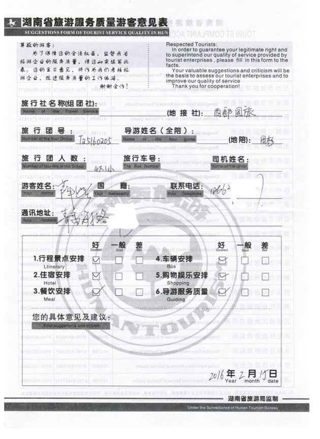【旅游接待回顧】 2月份,青島薛女士一行5位貴賓與湖南西部(張家界)中國國際旅行社工作人員——向翅取得聯(lián)系,經(jīng)過商談,雙方達成協(xié)議并簽訂旅游合同,于2月11日抵達張家界,開始張家界之旅。此次行程是由我社優(yōu)秀導游——田杉負責旅游接待工作,田杉在旅游過程中講解詳細,客人也很滿意。同時也感謝薛女士一行貴賓選擇湖南西部(張家界)中國國際旅行社,以及您對湖南西部國旅的信任與支持。我們會繼續(xù)努力,做好旅游接待工作。期待下一次與您的合作,祝您愉快!