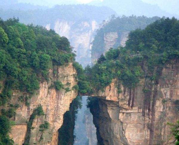 “后花園”至天下第一橋,有一條全長2000多米的游道,路面多為白色的條石鋪成,站在遠(yuǎn)處觀望,很像一條白色的綢帶打了兩個(gè)結(jié),一頭系在“迷魂臺(tái)”,一頭第在“天下第一橋”。信步漫游,沿途可欣賞到“拜仙臺(tái)”、“百丈絕壁”、“小洞天”、“情人谷”等別有情趣的景點(diǎn),這里海拔不高,一般不受氣候影響,慢慢品味,定會(huì)使您賞心悅目。“天下第一橋”是張家界“十大絕景”之一。也是袁家界的標(biāo)志性景點(diǎn),它是居于兩山之間形成的一座天然石橋,而兩山原為一體,橋身是兩山相連的關(guān)鍵部分,但因中間石質(zhì)較為薄弱,由于風(fēng)化、崩塌作用的影響,又經(jīng)過日曬雨淋、流水洗刷、山洪沖擊,久而久之,終于形成今天這一特別的奇景……。自杉刀溝上袁家界,沿絕壁頂部邊緣遨游,至于中坪“觀橋臺(tái)” 遙望千米之外,只見一天然石橋凌空飛架兩峰之巔,氣勢磅礴,奇?zhèn)ソ^倫,被稱為“天下第一橋”。石橋?qū)拑H3米,厚5米,跨度約50米,相對(duì)高度近400米。天下第一橋與夫妻巖并稱“張家界雙絕”!疤煜碌谝粯颉睒蛎鎸拑擅祝袼拿,跨度為二十多米,高度為三百多米,是世界是迄今為止所發(fā)現(xiàn)落差最高的天然石橋。