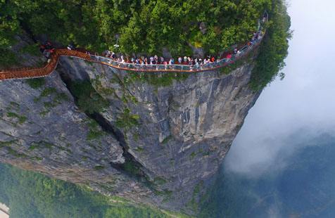 站在棧道上俯瞰群山,古人“會(huì)當(dāng)凌絕頂,一覽眾山小”的感覺油然而生。由于天門山是國家森林公園,植被特別豐富,加上典型的喀斯特地貌,所以,在這條棧道上更能找到一種在乘坐直升飛機(jī)飛越熱帶雨林大峽谷的感覺,這平時(shí)只能在電影里看到的場景,在這里能讓你身臨其境。